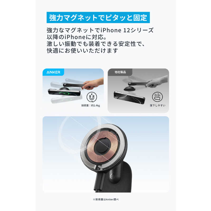 強力なマグネットでiPhone 12シリーズ以降のiPhoneに対応。激しい振動でも固定が緩むことはなく、快適にお使いいただけます。