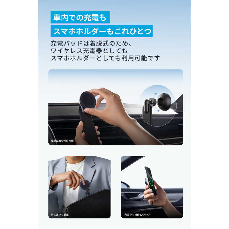 充電パッドは着脱式のため、車内でも場所を問わずワイヤレス充電器としてもスマホホルダーとしても利用可能です。