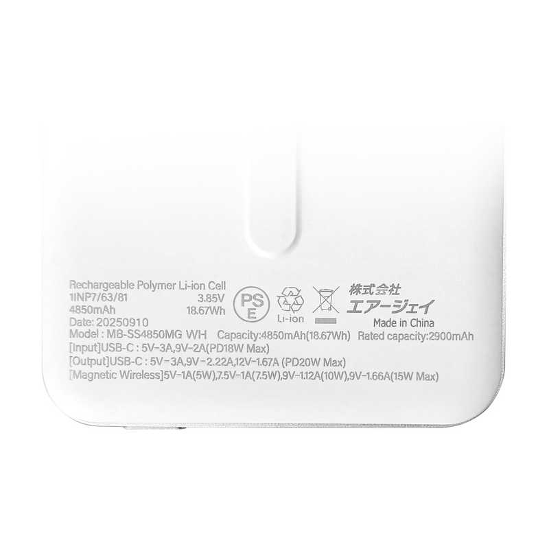 エアージェイ air-j マグネットワイヤレス充電対応 準固体モバイルバッテリー 4850mAh MBホワイト -SS4850MG WH