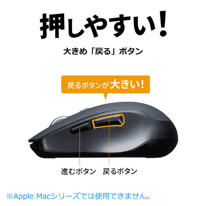 ●ママウスポインタを動かさず、手元のサイドボタンにも「戻る・進む」の2ボタンを搭載しており、Webブラウザで操作をスピーディに行えます。※Apple Macシリーズでは使用できません。