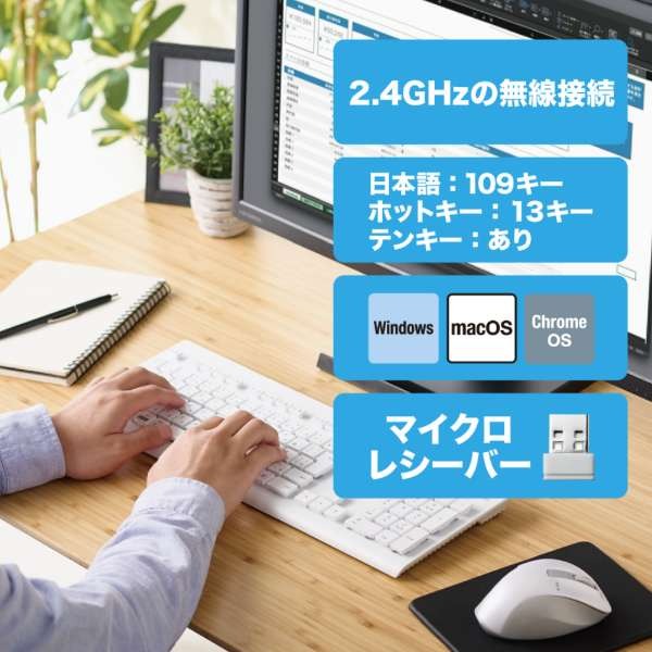 ●パソコンのUSBポートにレシーバーユニットを挿すだけですぐに使用できるワイヤレスタイプです。