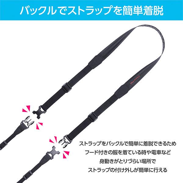 ストラップをバックルで簡単に外せるので、三脚使用時にストラップが邪魔になりません。