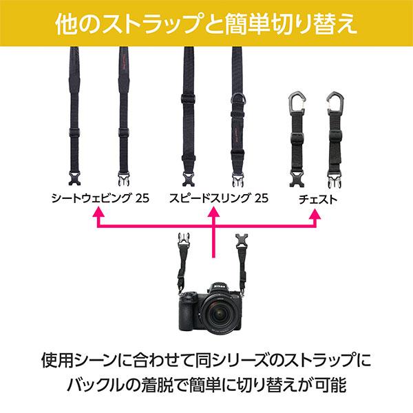 カメラを複数台持ち運ぶ際に、別売りの「ベース」を2台目以降のカメラに装着しておけば、バックルの着脱で簡単にストラップを切り替えられるため、ストラップ1本を使いまわしが可能。