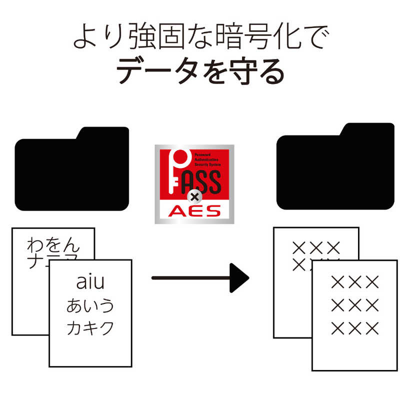 また上記の PASS(パスワード自動認証機能付暗号化)に加え、AES(256bitデータ暗号化機能)をご利用できます。