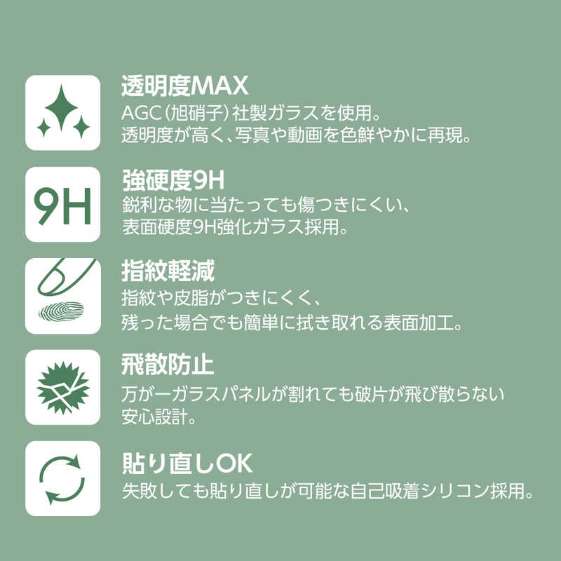 AGC(旭硝子)社製ガラスを使用。透明度が高く、写真や動画を色鮮やかに再現。