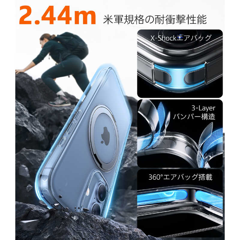 ・全面360°エアバッグと高耐久素材を採用し、スマートフォンを全方位からしっかりと守り、安全性を徹底追求。