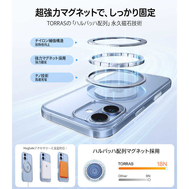 ・内蔵された38個のN52磁石により18Nの吸着力を実現し、すべてのMagSafe対応のモバイルバッテリーに対応可能。