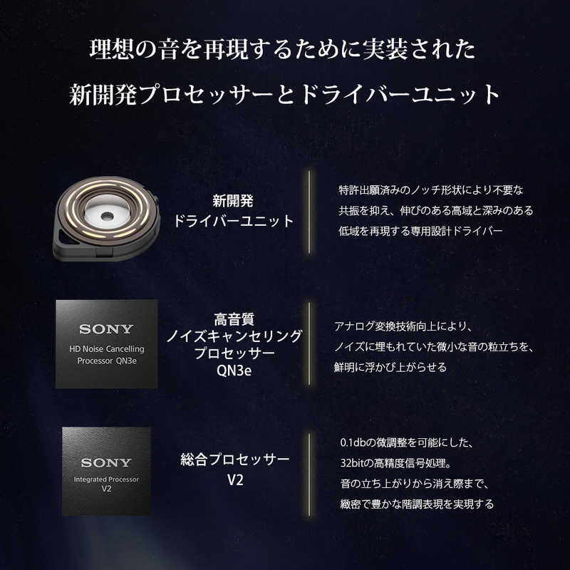 さらに新開発の高音質ノイズキャンセリングプロセッサーQN3eと統合プロセッサーV2の2つのプロセッサーによる制御により、音の再現性、解像度が大きく進化しました。