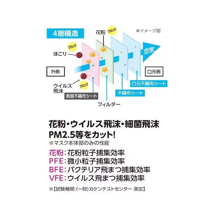 ●4層構造で、花粉、ウイルス飛沫、細菌飛沫、PM2.5等をカットします。(※マスク本体部のみの性能です)。