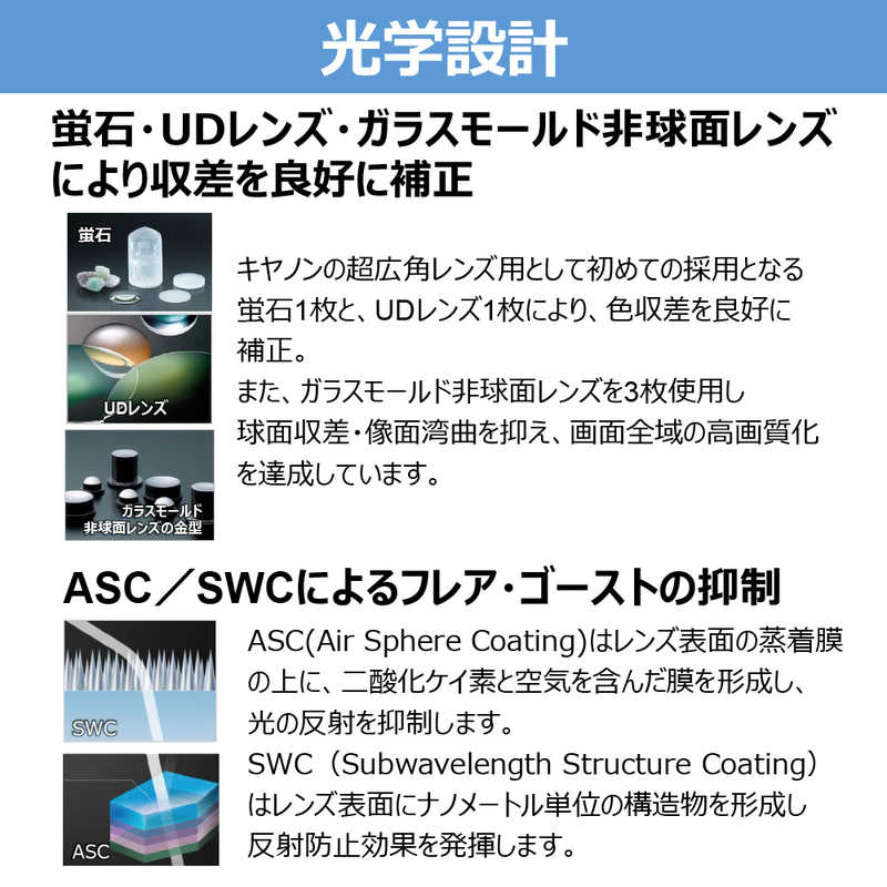 ●キヤノンの超広角レンズでは初めて採用した「蛍石」、「UD レンズ」、「BRレンズ」を効果的に配置し、画質劣化の原因となる色収差を抑制。