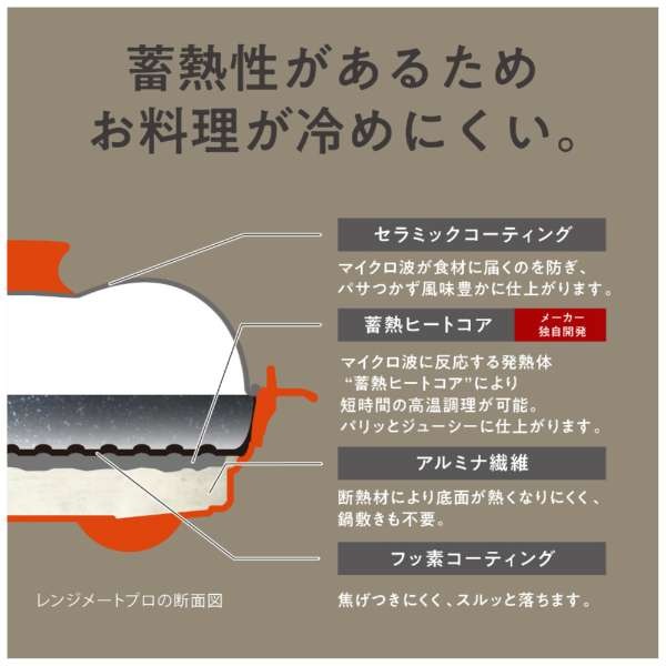 セラミックコーティングのふたがマイクロ波を遮ることで加熱ムラを防ぎます。