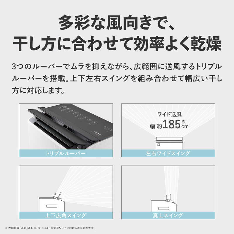 ●たっぷりの衣類も、一気に乾く高い除湿性能と広範囲に風を届けるトリプルルーバーで、大量の衣類を一気に乾かします。